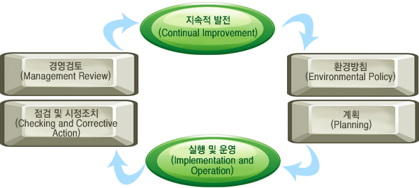 ȯ°æ°æ¿µÃ¼Á¦´Â À§¿¡¡´±×¸²¡µ°ú °°ÀÌ °èȹ(Plan), ½ÇÇà(Do), Á¡°Ë ¹× ½ÃÁ¤(Check), °³¼±(Action) µî ¼ÒÀ§ P¡¤D¡¤C¡¤A ´Ü°è·Î ±¸¼ºµÇ¾î ÀÖÀ¸¸ç, ÀÌÀÇ °è¼ÓÀûÀÎ ¹Ýº¹½ÃÇàÀÌ È¯°æ¼º°ú ¹ßÀüÀÇ ÇÙ½ÉÀÎ °ÍÀÌ´Ù. ¿©±â¿¡¼ ³ªÅ¸³½ ȯ°æ°æ¿µÃ¼Á¦ ¿î¿µÀÇ ÇÙ½É ³»¿ëÀ» ¿ä¾àÇÏ¸é ¾Æ·¡¿Í °°´Ù.